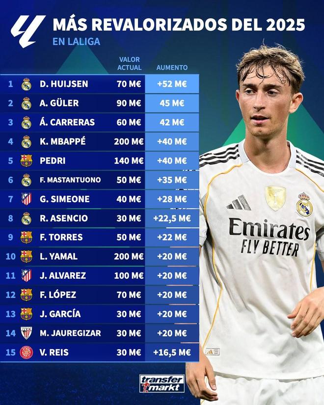 北京时间12月24日,德专列出了2025年身价增幅最高的15名西甲球员。休伊森一年内身价增加5200万欧元位列第一,古勒以4500万欧元的增幅位居第二,阿尔瓦罗·卡雷拉斯以4200万欧元的增幅位居第三,姆巴佩和佩德里并列400万欧元。 2025年德国西甲前15名球员身价增长:1.休伊曾(皇马)7000万欧元+5200万欧元2.古勒(皇马)9000万欧元+4500万欧元3.阿尔瓦罗·卡雷拉斯(皇马)6000万欧元+4200万欧元4.000万欧元+4200万欧元(皇马4.0) 5. 佩德罗(巴塞罗那) 1.4亿欧元+4000万欧元 6. 马斯坦托诺(皇家马德里) 5000万欧元+3500万欧元 7. 朱利亚诺·西蒙尼(马德里竞技) 4000万欧元+2800万欧元 8. 劳尔·阿森西奥(皇家马德里) 3000万欧元+2250万欧元+2250万欧元 2200万欧元欧元 10. 亚马尔(巴塞罗那)200 英里10亿欧元+2000万欧元 11.朱利安·阿尔瓦雷斯(马德里竞技)1亿欧元+2000万欧元 12.费尔明·洛佩斯(巴塞罗那)7000万欧元+2000万欧元 13.胡安·加西亚(巴塞罗那)3000万欧元+2000万欧元+2000万欧元 毕尔巴鄂)3000万欧元+2000万欧元 15.维托·雷斯(赫罗纳)3000万欧元+1650万欧元