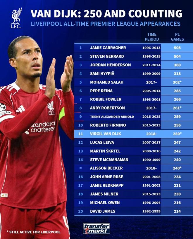 北京时间12月14日,英超第16轮比赛中,利物浦主场2-0击败布莱顿。红军队长范迪克踏上了为俱乐部踢250场英超比赛的里程碑。同时,德专还列出了利物浦历史上英超出场次数前20名的球员。利物浦历史上英超出场次数前20名: 1.卡拉格 1996年至2013年 508场 2.杰拉德 1998年至2015年 504场 3.亨德森 2011年至2024年 360场 4.海皮亚 1999年至2009年 318场 5.萨拉赫 2017年302场 6. 雷纳 2005年至2014年 285场 7. 罗比·福勒 1993年至2001年 266场 8. 261场 9. 亚历山大-阿诺德 2016年至2025年 259场 10. 菲尔米诺 2015年至2023年 256场 11. 范迪克 2018 250 场比赛 12. 卢卡斯·莱瓦 2007 年至 2017 年 247 场比赛 13. Skrtel 2008 年至 20162 年比赛14.麦克马纳曼 1990 年至 1999 年 240 场 14. 阿利森 2018 年至今 240 场 16. 里瑟 2001-2008 1991-2002 231 场 18. 米尔纳 2015-2023 230 场 19. 迈克尔·欧文 1996-2004 216 场 20.达夫id 詹姆斯 1992-1999 214场 [咪咕独家观看英超联赛]