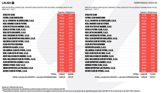 西甲联赛最近公布了2024-25赛季电视转播收入分配数据。本赛季联赛总收入为12.92亿欧元,其中收入最高的俱乐部是皇家马德里,约为1.579亿欧元,其次是巴塞罗那,约为1.564亿欧元。根据西甲官方公布的最终会计数据,2024-25赛季音像版权总收入为12.92亿欧元。西甲调整后,皇马以约1.5792亿欧元成为收入最高的俱乐部,其次是巴萨,约1.5645亿欧元,马竞以约1.0817亿欧元位居第三。这三家具乐部的总收入约占联赛总收入的35%。西甲各俱乐部具体调整后的电视转播权收入如下: 皇家马德里:1.5792亿欧元 巴塞罗那:1.5645亿欧元 马德里竞技:1.0817亿欧元 A毕尔巴鄂:7226万欧元皇家社会:6780万欧元皇家贝蒂斯:6467万欧元塞维利亚:6395万欧元5781万欧元赫罗纳:556欧元4万欧元瓦伦西亚:5253万欧元奥萨苏纳:4809万欧元塞尔塔维戈:4577万欧元赫塔菲:4546万欧元马洛卡:4389万欧元 阿拉维斯:4346万欧元 西班牙人:4342万欧元。巴利亚多利德:4153万欧元 拉斯帕尔马斯:4063万欧元 莱加内斯:3993万欧元